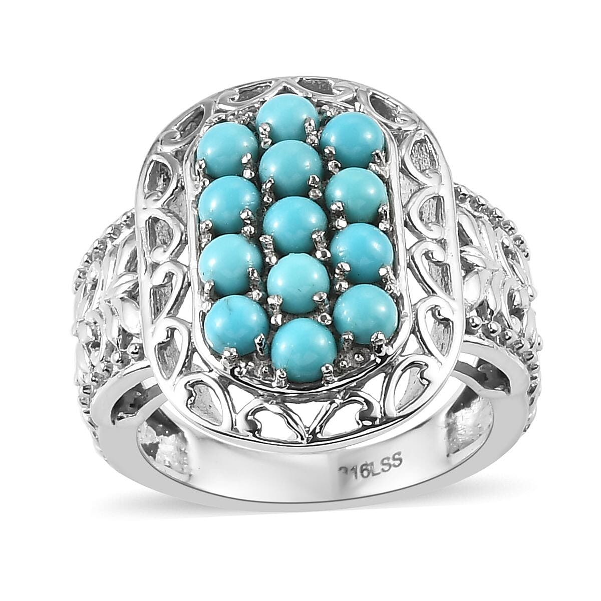 Featuring turquoise cluster at its center, this premium Sleeping Beauty turquoise ring in stainless steel boasts a scroll metal border and intricate scroll metalwork on its shank. Crafted for durability and style, this turquoise cluster ring for women offers a striking addition to any jewelry collection.
