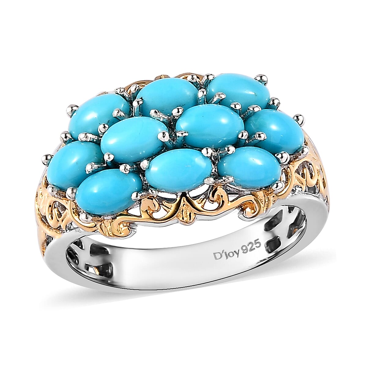Behold, the spellbinding charm of our premium Sleeping Beauty turquoise ring. Crafted in a cluster design featuring east-west placement of oval gemstones, this unique masterpiece dances in a luxurious blend of vermeil yellow gold and platinum over sterling silver. Unveil the mystique of premium gemstones—your allure awaits.