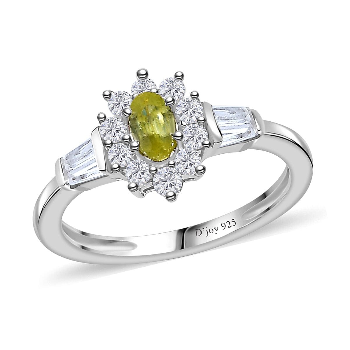 This premium Sava sphene ring for women features a prong-set sphene in the center, surrounded by a halo of prong-set white zircons. This sphene fashion ring in silver showcase white zircons on the shoulder.
