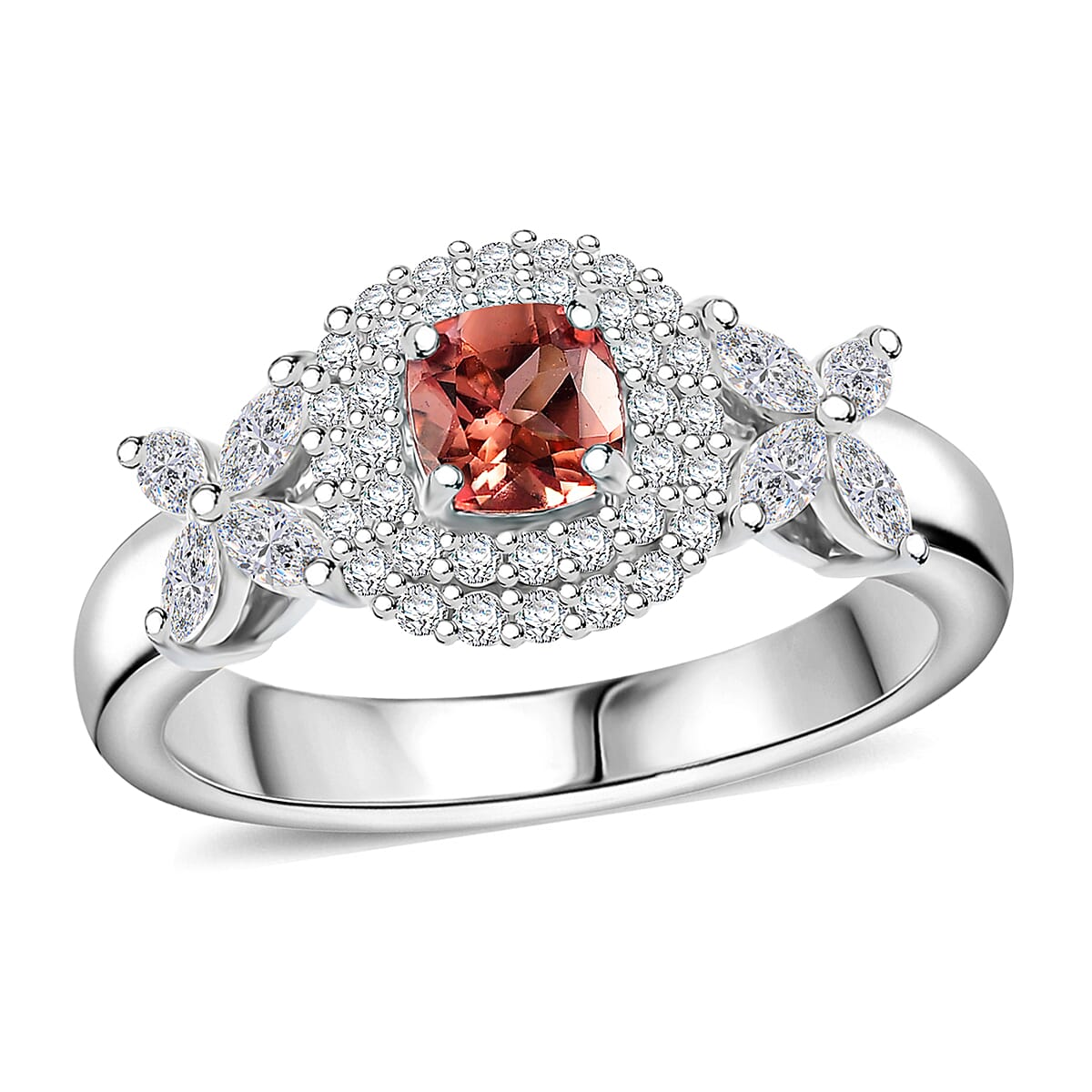 Premium Tanzanian Blush Garnet and Moissanite 0.90 ctw Blossom Halo Ring in Rhodium Over Sterling Silver (Size 9.0)