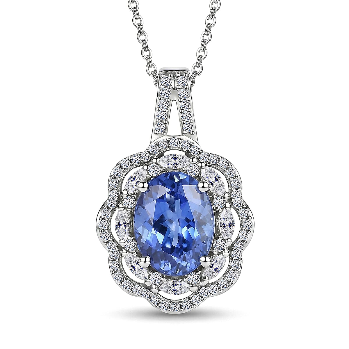 Premium Tanzanite and Luxuriant Lab Grown Diamond E-F VS 2.30 ctw Blue Crownfire Pendant Necklace in 10K White Gold 20 Inches
