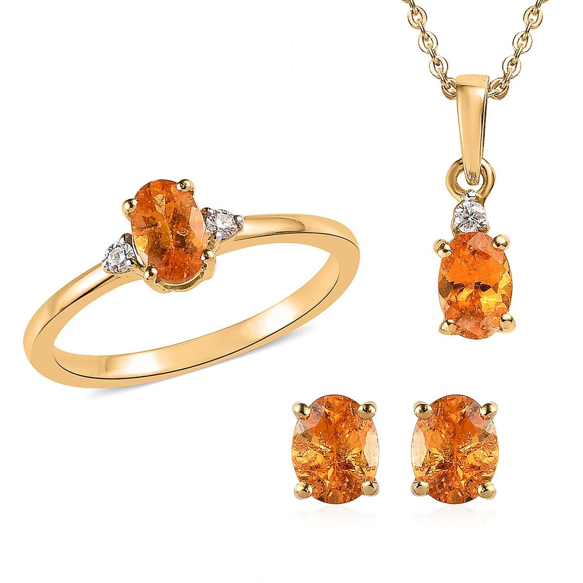 Premium Viceroy Spessartine Garnet and Moissanite Ring (Size 7.0), Stud Earrings and Pendant Necklace 20 Inches in Vermeil YG Over Sterling Silver 2.10 ctw