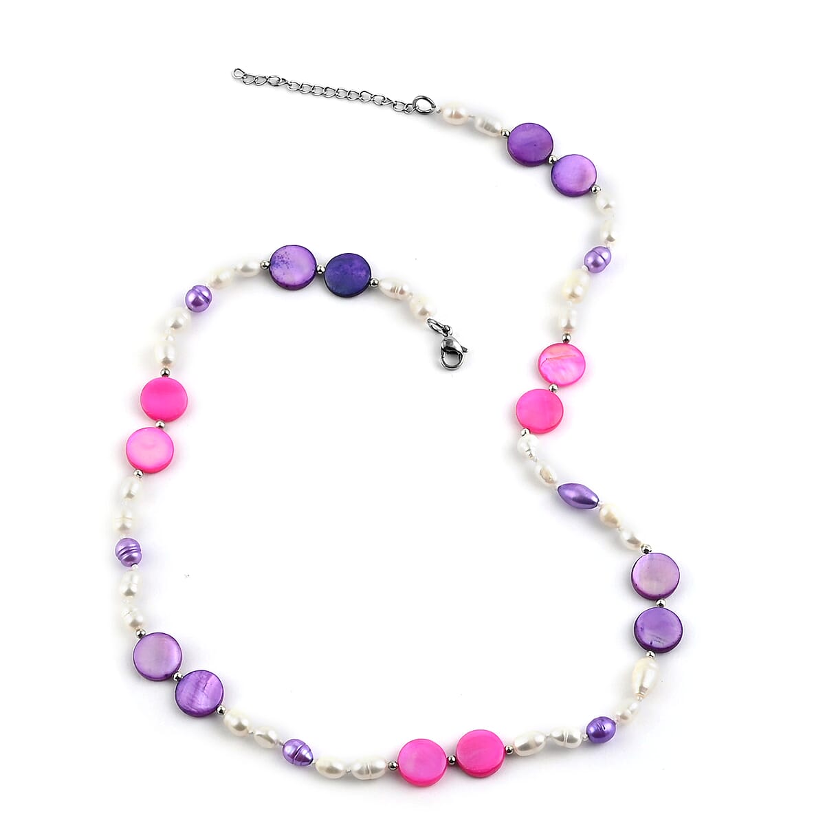 Purple and Coconut Shell Pearl, Purple and White Freshwater Pearl Necklace 20 Inches in Silvertone and Stainless Steel