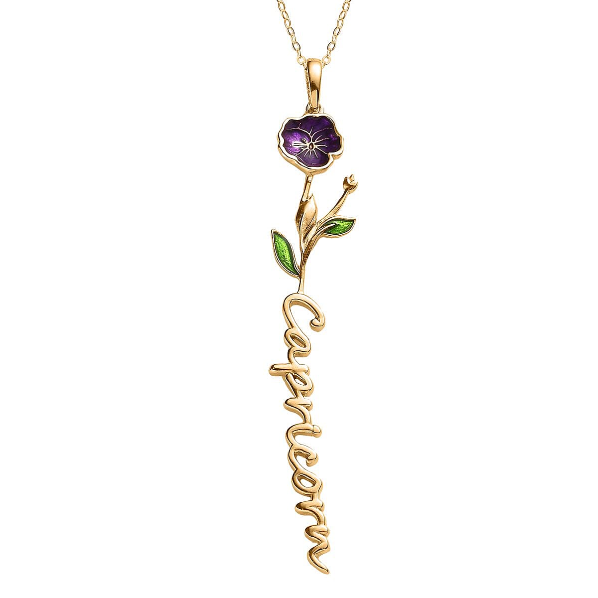 Purple and Green Enameled Capricorn Zodiac Pansy Birth Flower Pendant Necklace,Statement Jewlery,Gift For Women (16-18 Inches) in 14K YG Over Sterling Silver