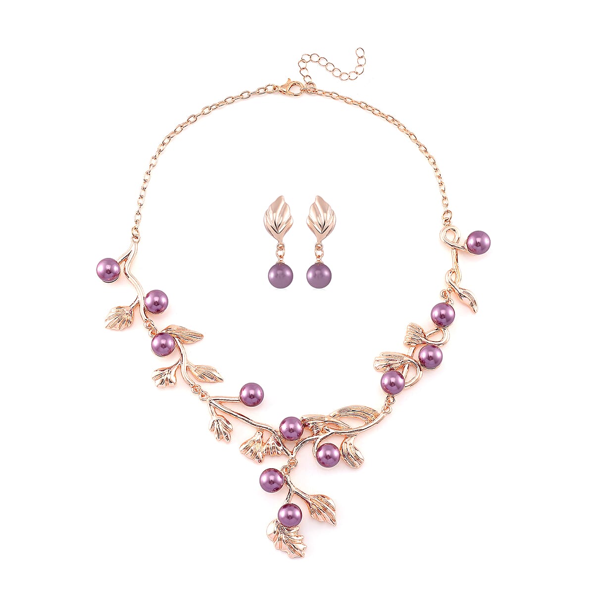 Purple Color Shell Pearl Leaf Necklace and Earrings in Rosetone 18-20 Inches