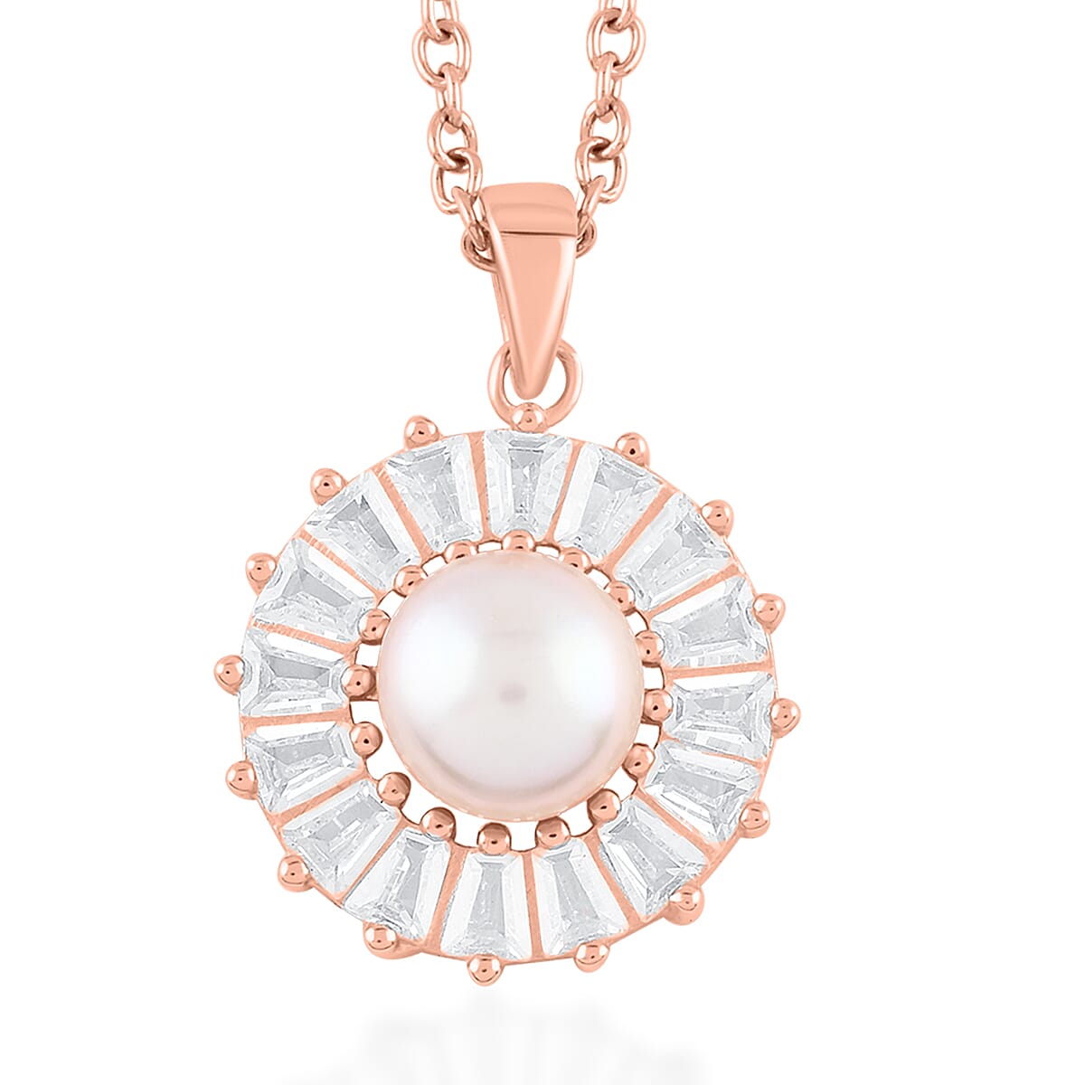 Purple Freshwater Pearl and Simulated Diamond Floral Pendant in 14K Rose Gold Over Sterling Silver with ION Plated RG Stainless Steel Necklace 20 Inches 1.00 ctw