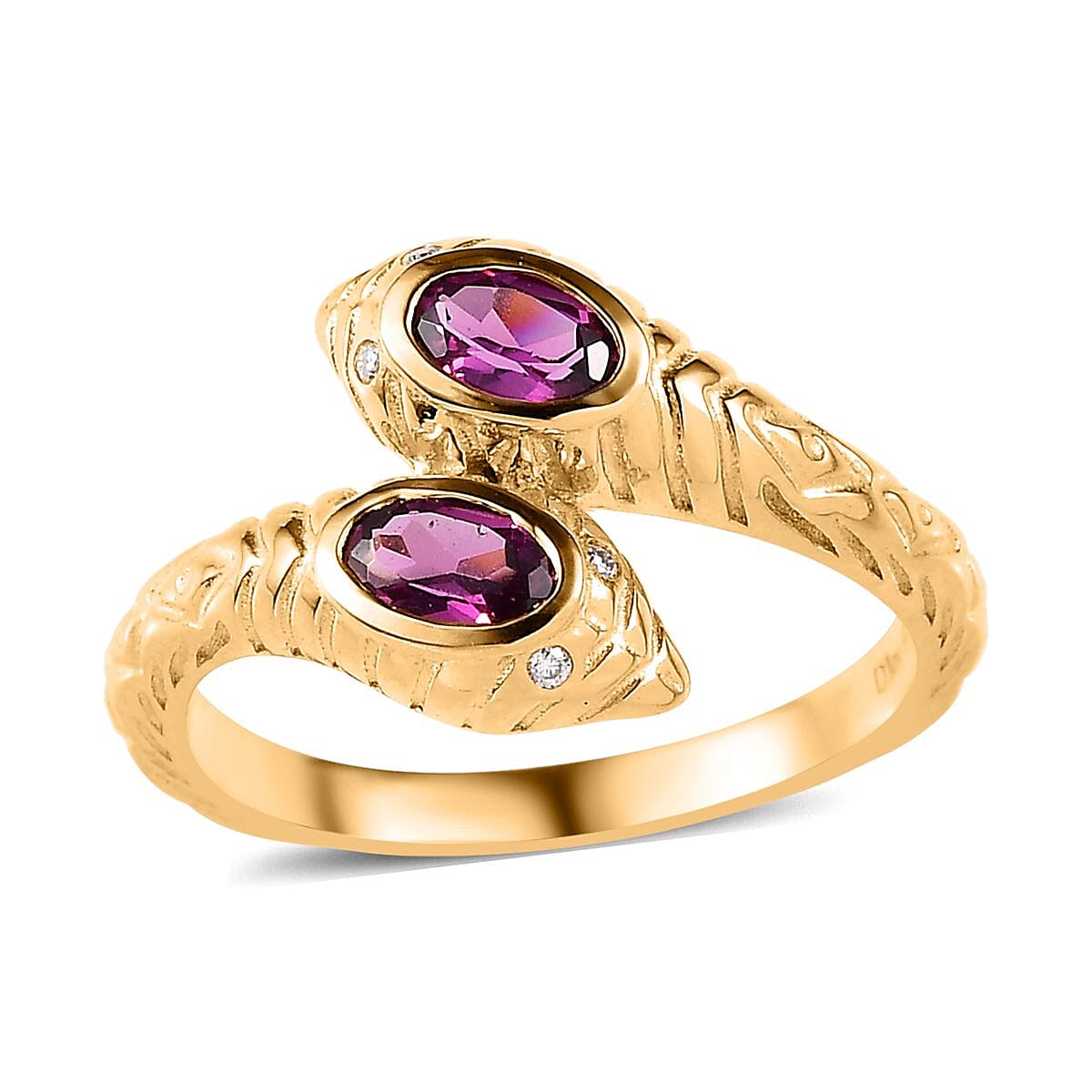 Purple Garnet and Moissanite Snake Bypass Ring in Vermeil Yellow Gold Over Sterling Silver (Size 9.0) 0.60 ctw