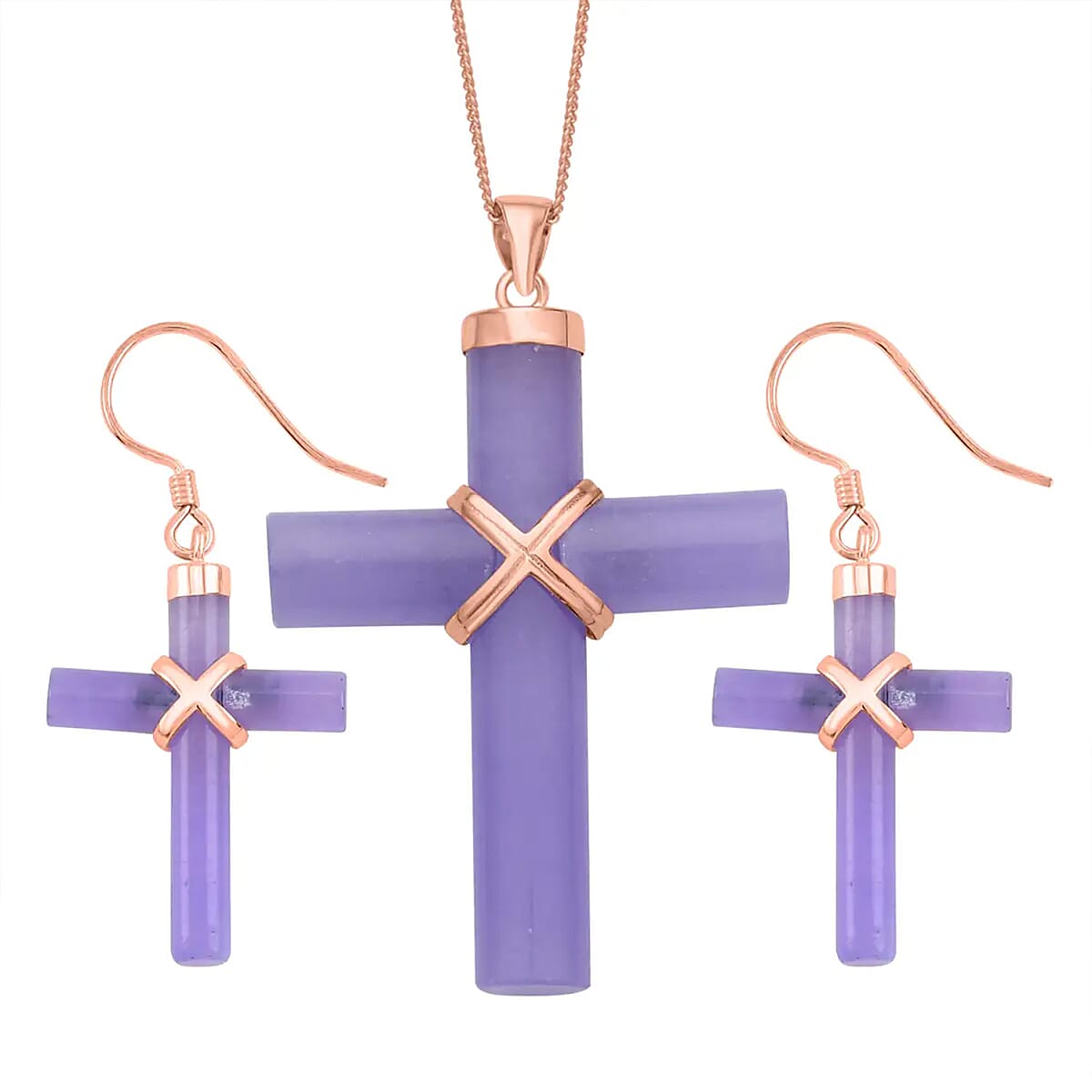 Purple Jade (D) Cross Earrings and Pendant Necklace 18 Inches in Vermeil Rose Gold Over Sterling Silver 48.50 ctw