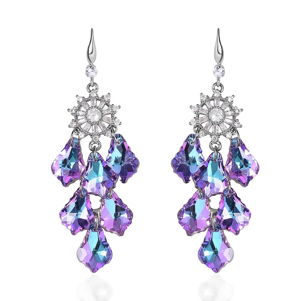 These color glass and Austrian crystal chandelier earrings dazzle with their silvertone finish and intricate design, symbolizing elegance and grandeur. Featuring a fish hook clasp, these dangle earrings blend timeless style with exquisite craftsmanship.