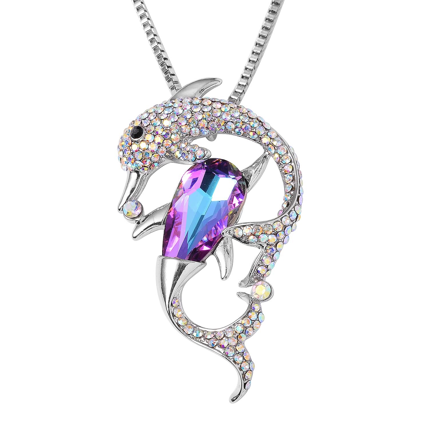 Purple Magic Color Glass, Mystic White and Black Austrian Crystal Dolphin Necklace 29-31 Inches in Silvertone