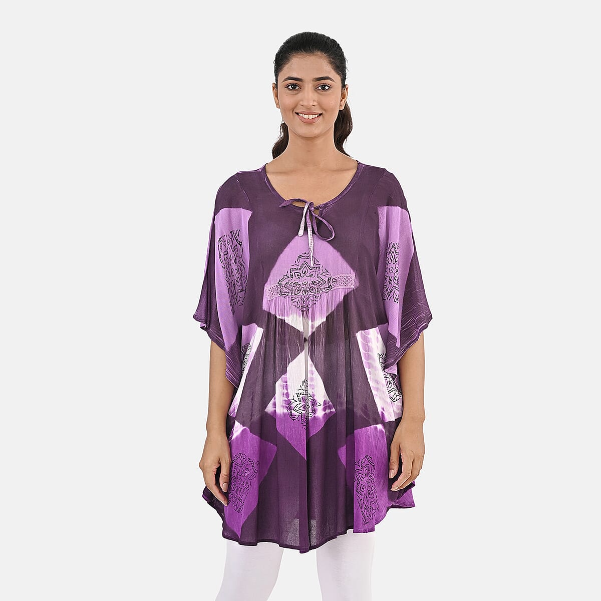 Purple Rayon Crepe Tie Dye Block Print Kaftan with Necktie - One Size Fits Most