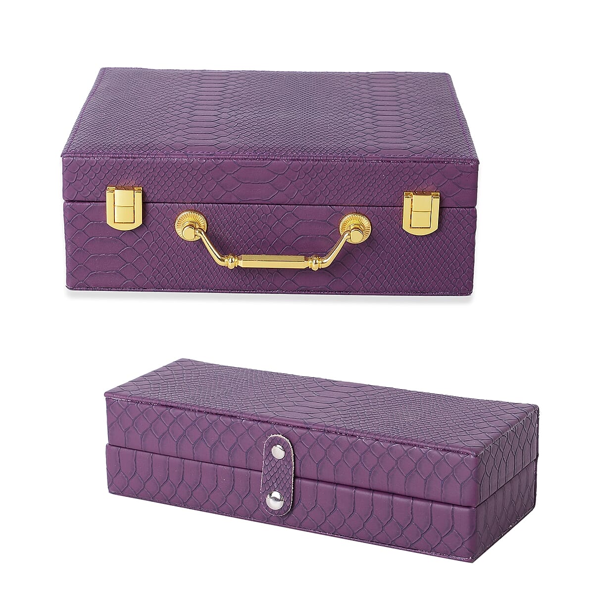 Carry your precious bauble anywhere in style. This set of two jewelry boxes is covered with purple dragon-skin pattern faux leather on the outside with cushiony velvet interior. The larger piece is furnished with total 11 small compartments and a mirror. The piece comes with a removable little travel case for short trip. The pieces are detailed with button clasp, and golden lock and handle for added security and ease in handling.