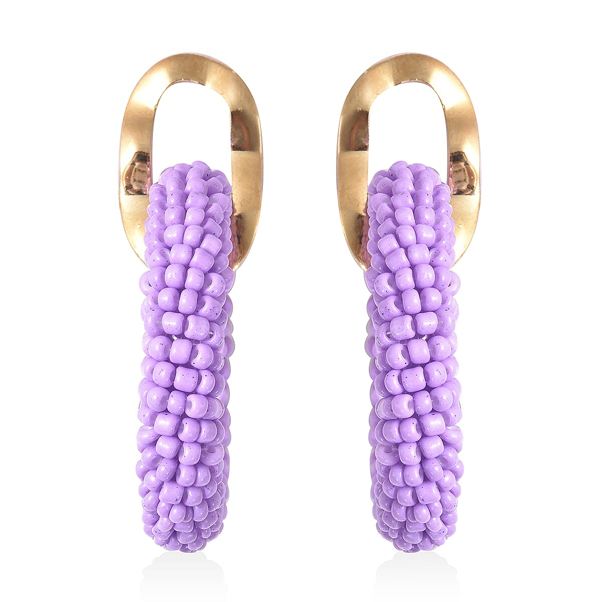 Purple Seed Beaded Hoop Earrings in Goldtone
