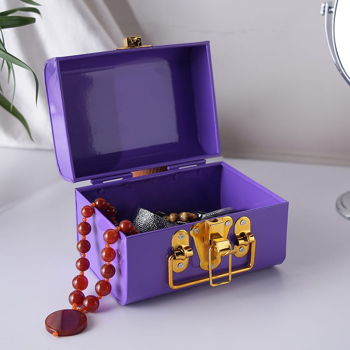 Purple Vintage Style Plain Colored Metal Storage Trunk with Clasp Lock and Handle Drop