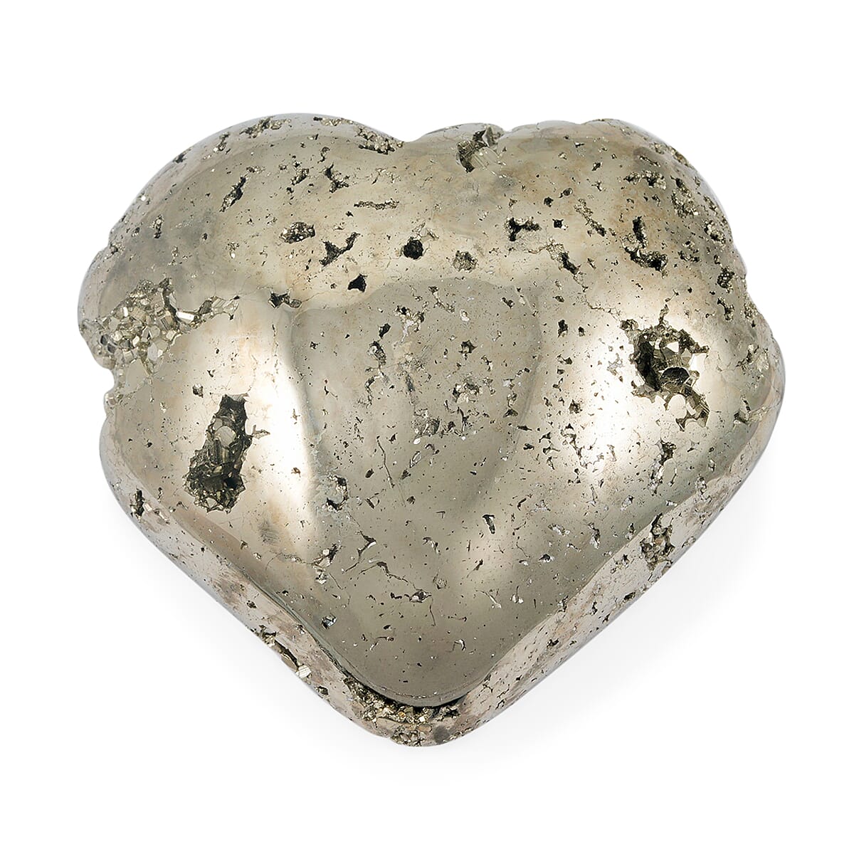 Polished into a heart-inspired silhouette, this pyrite piece highlights natural golden brilliance. Its smooth curves and metallic luster create a refined decorative accent. Designed to add warmth, symbolism, and radiant contrast to curated interiors.