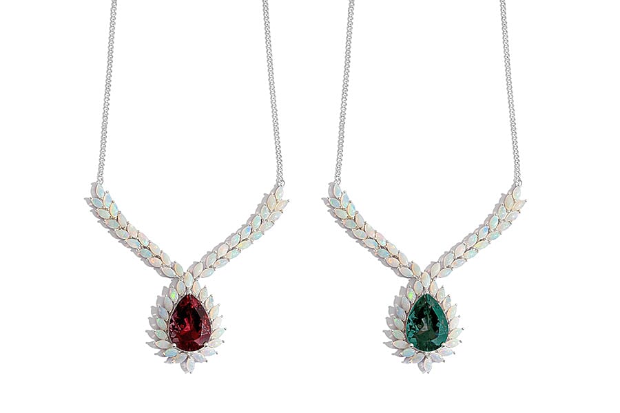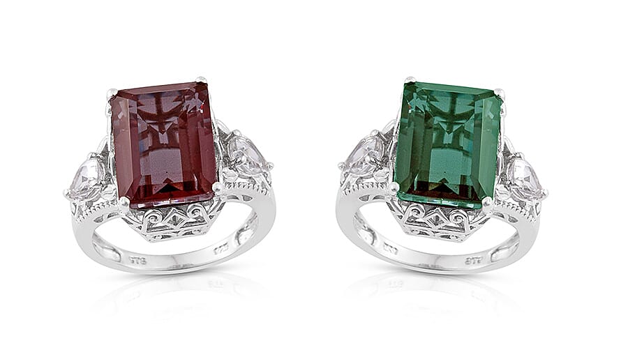 Reinterpreting the amazing optical qualities of alexandrite gemstones, Alexandria quartz displays the soothing blue-green hues of precious emerald under fluorescent light (daylight). Move the gemstone to incandescent light (candlelight), and witness the incredible change! It shows another facet of its character – striking purple-reds that add an element of romance to your special occasion.