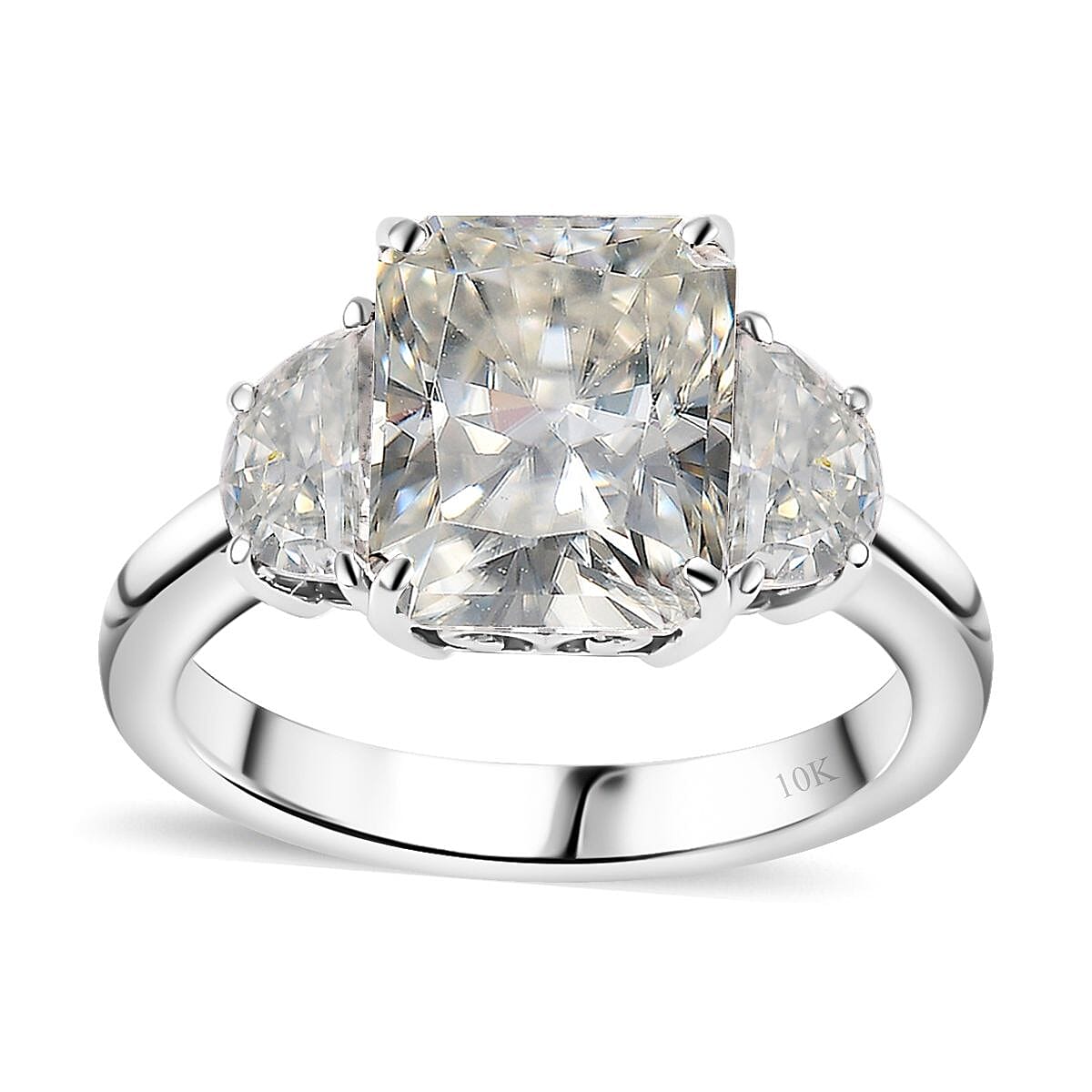 This moissanite ring in 10K white gold is inspired by the trilogy design. All stones are securely set in prong settings and feature radiant-cut moissanite gemstones, known for their exceptional shine and brilliance. Crafted with 10K white gold and a premium finish, this trilogy ring offers elegance and durability.