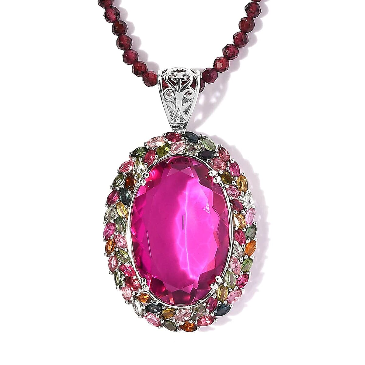 Radiant Orchid Quartz (Triplet) and Multi-Tourmaline Pendant with Rhodolite Garnet Beaded Necklace 18 Inches in Platinum Over Sterling Silver 167.25 ctw