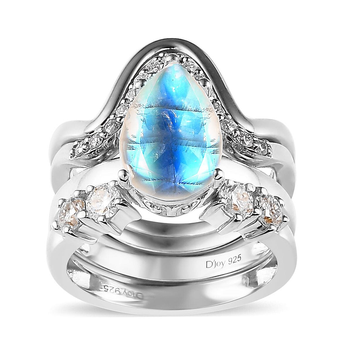 Rainbow Moonstone and Moissanite Set of 4 Stackable Ring in Platinum Over Sterling Silver (Size 9.0) 3.20 ctw