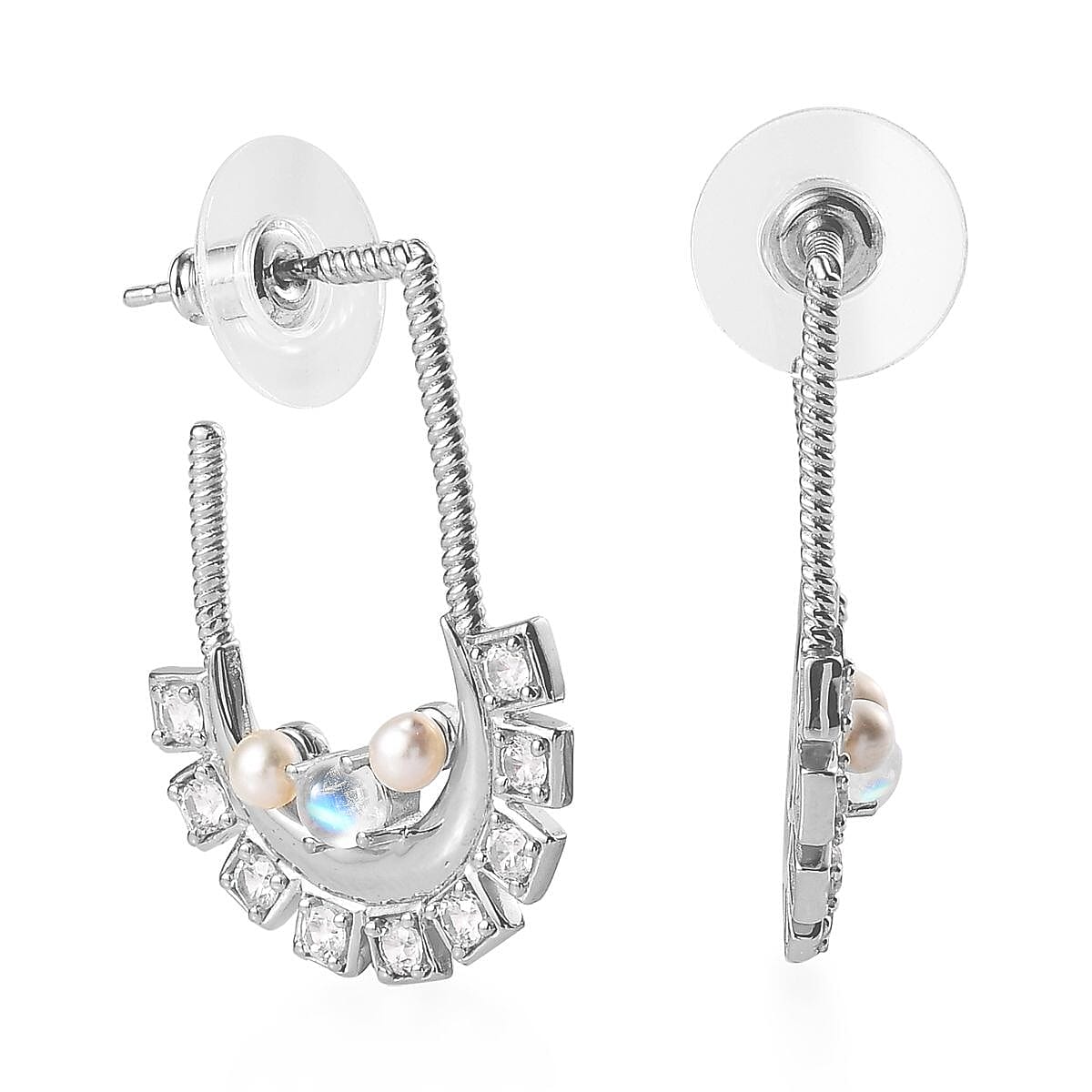 Rainbow Moonstone, Freshwater Pearl and White Zircon Moon Statement Earrings in Platinum Over Sterling Silver 2.80 ctw