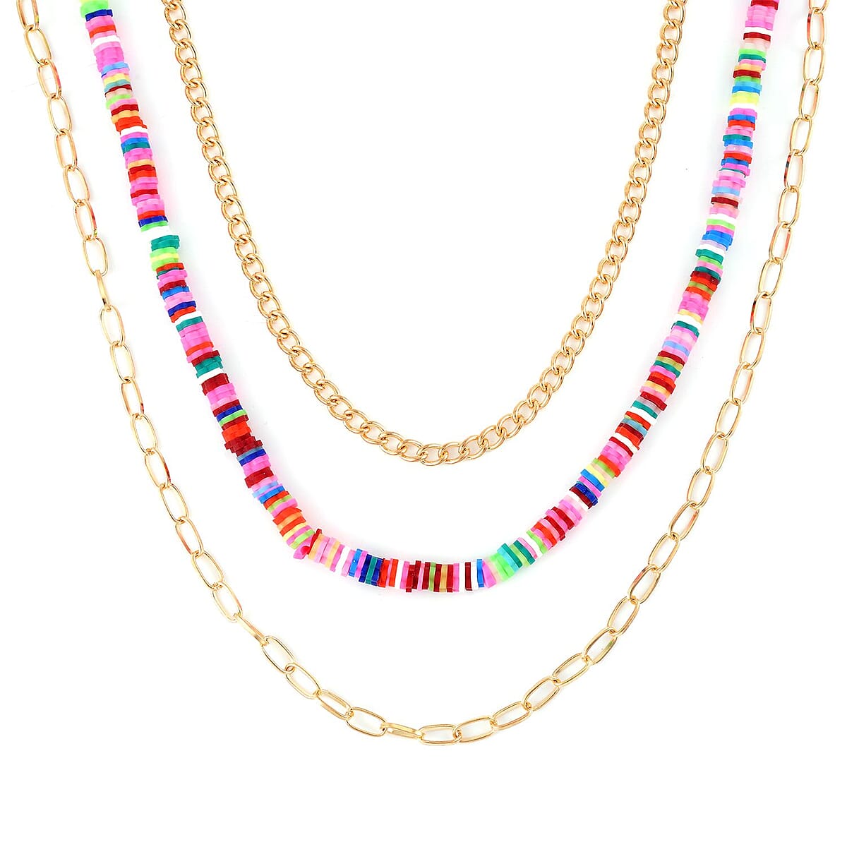 Rainbow Resin Clay 3 Layered Necklace 20-22 Inches in Goldtone