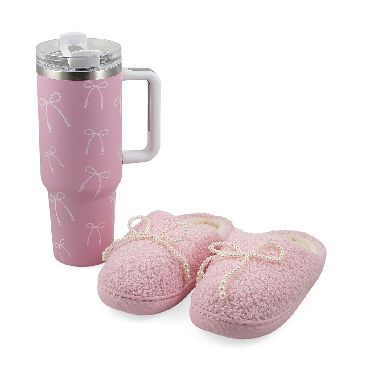 RAMPAGE Pink Pearl Bow Teddy Slippers with Matching Stainless Steel Water Bottle Gift Box – Medium (7/8)