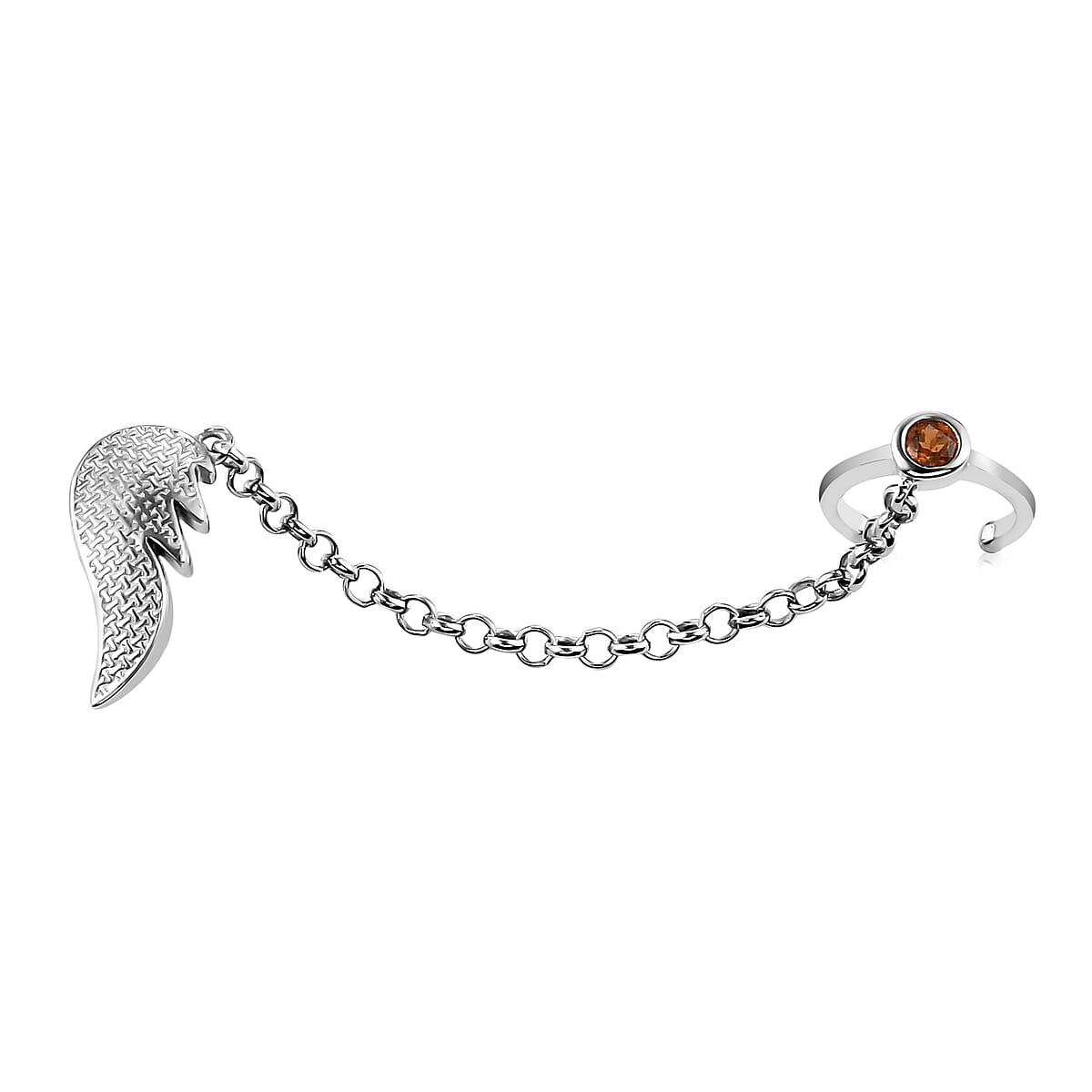 This fancy earring is the best adornment for those not looking for a permanent piercing. The design includes a feather shape motif that hangs free attached to an ear cuff flaunting Ratnapura Hessonite Garnet.