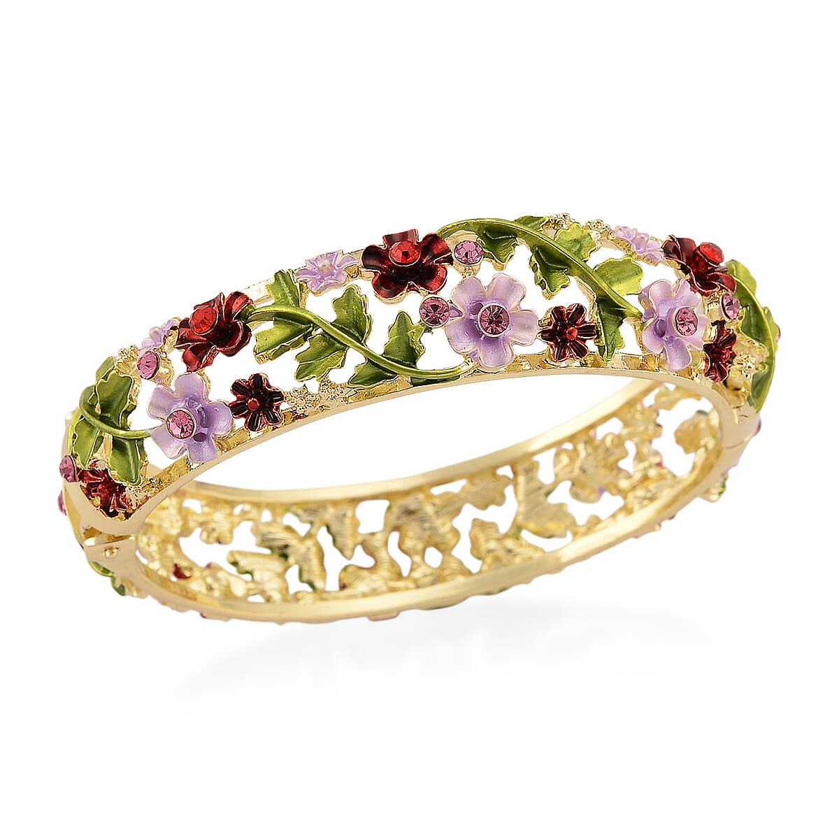 Red and Pink Austrian Crystal, Multi Color Enameled Floral Bangle Bracelet in Goldtone (7-7.5In)