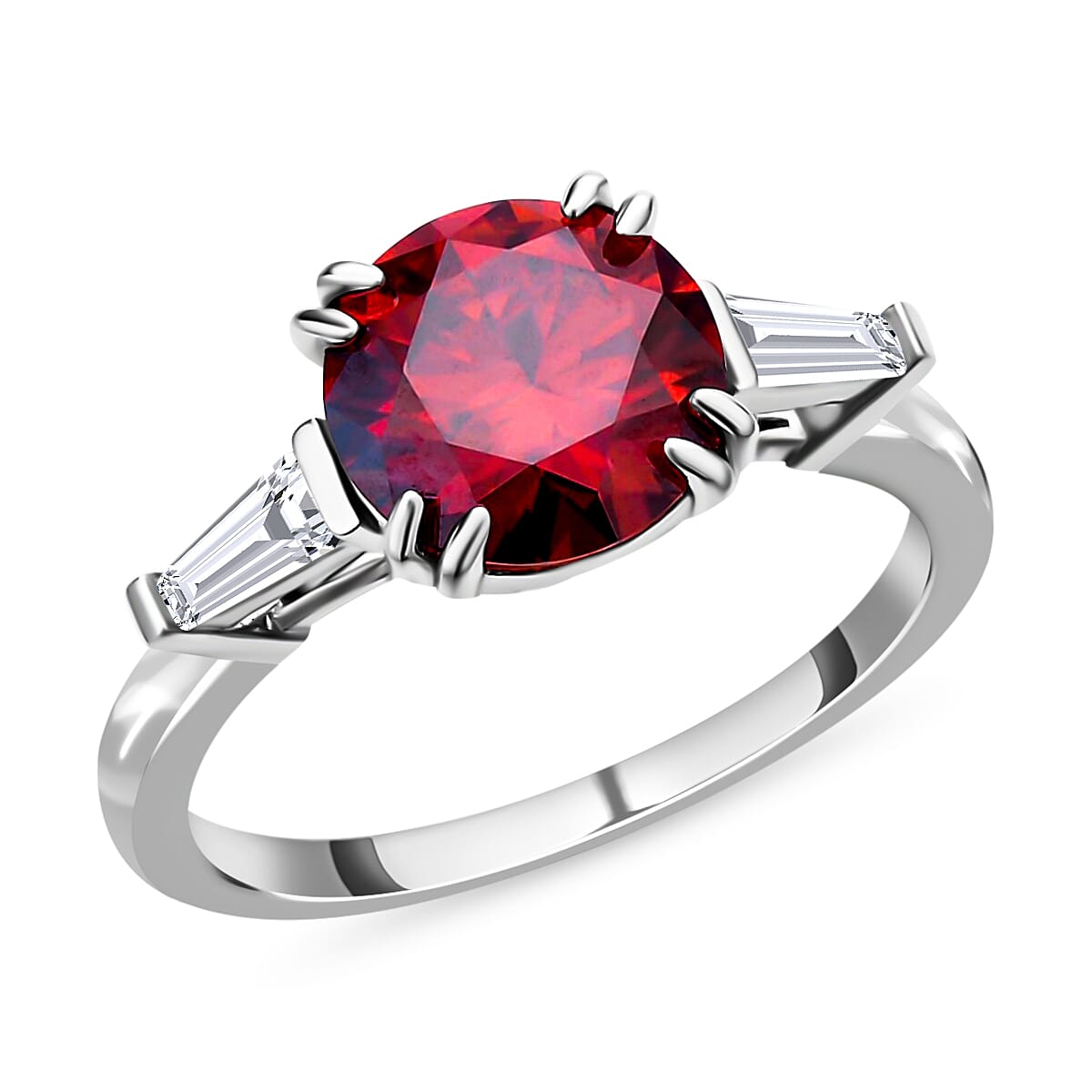 Looking for a statement piece of jewelry that will turn heads? Look no further than this stunning red moissanite ring, crafted from sterling silver metal with a modern interpretation of trilogy designs. This ring features a vibrant red moissanite center stone, flanked by two sparkling white moissanite taper baguettes on either side of a dazzling white diamond round.