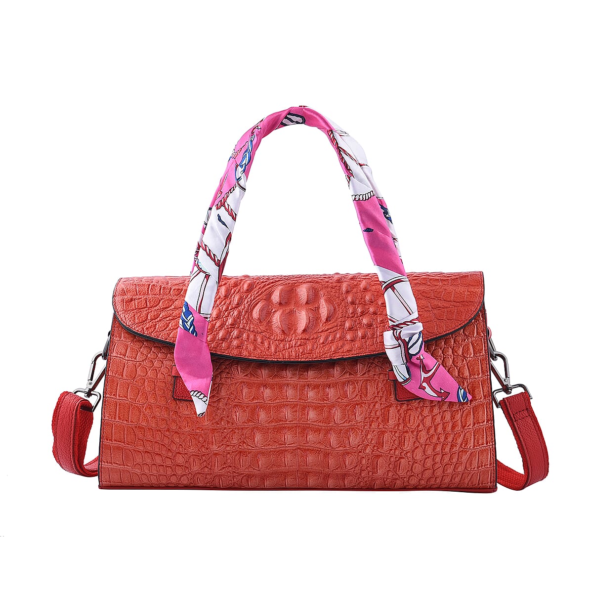 Red Crocodile Embossed Pattern Genuine Leather Shoulder Bag with Hand Scarf Strap and Shoulder Strap