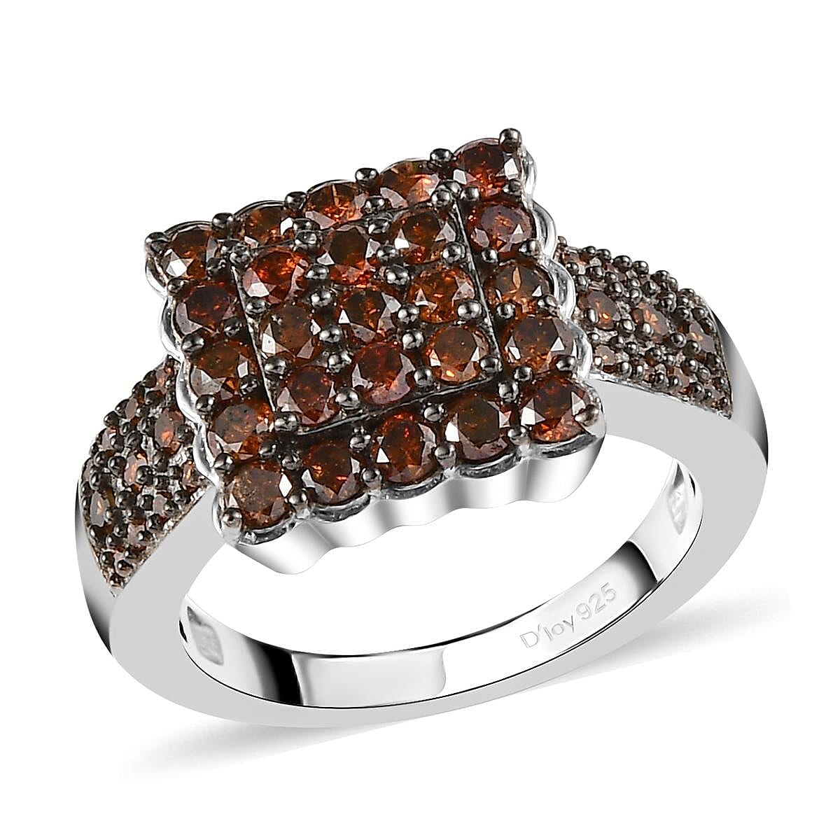 Inspired by the geometrical shape, this red diamond ring symbolizes stability and security. The dual square-shaped metal frame stacked in one another is studded with red-hued diamonds. The diamonds in the center are given a shared prong setting maximizing the color of the gem. Diamonds, the word is Derived from the Greek word “Adamas” which means invincible or indestructible. Red diamonds are the modern birthstone of April and rank ten on the Mohs scale of hardness. Red diamonds are the rarest of all fancy-colored gemstones adding uniqueness to this piece of jewelry. The triple row round gems on the shank add a luxurious look to the piece. Crafted in sterling silver, this ring can be paired with any outfit owing to its simplicity and elegance. The black rhodium plating adds a distinctive look to the piece.