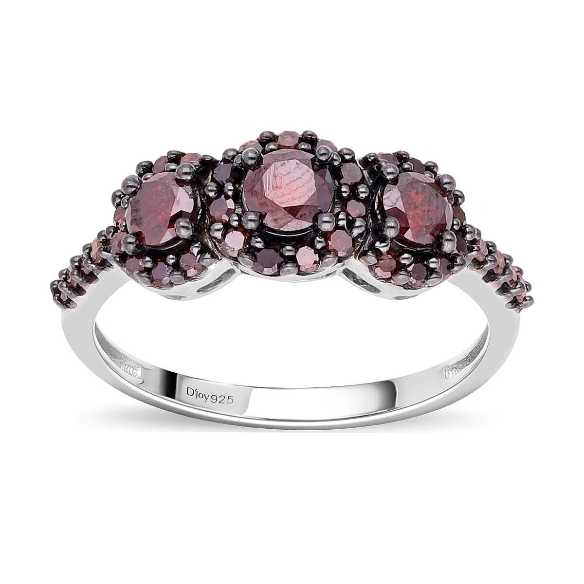 Make your every occasion memorable with this red diamond trilogy halo ring. The trilogy ring symbolizes a relationship's past, present, and future. They are a popular choice for couples, and with a perfect blend of contemporary style, this ring makes a beautiful engagement ring. This red diamond trilogy ring is combined with a halo style. The design includes three round gems in the center, each highlighted by accent red diamonds giving a halo look. Halo engagement rings are also the most significant trend, and the addition of this style makes this ring a timeless heirloom. The accent-colored diamonds flow down the shank, adding the pop of their subtle hue. Each of the gems is well set in prongs for a cleaner look and to protect the gems simultaneously. This ring is made in sterling silver, and platinum plating makes the jewelry tarnish-resistant and durable.