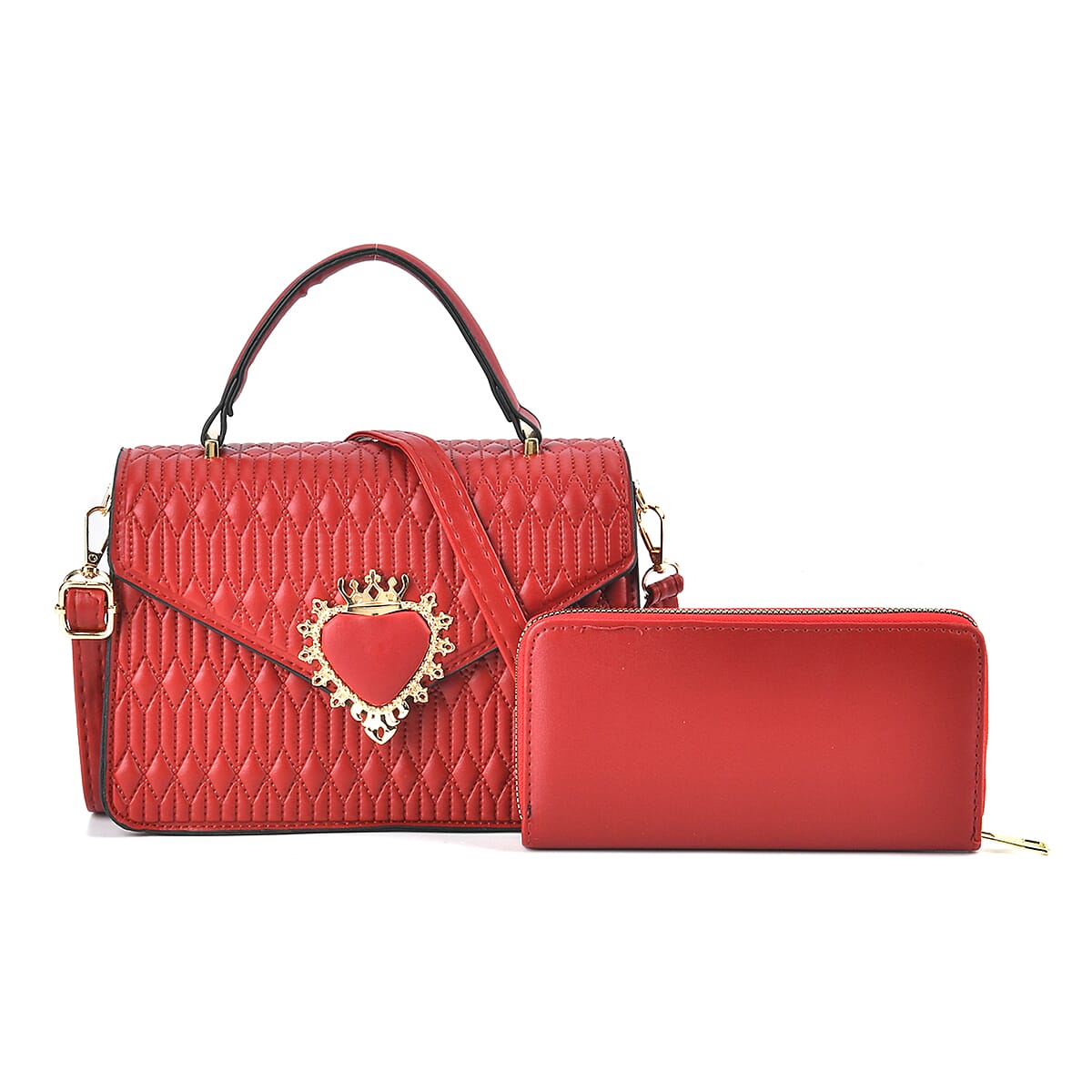 Red Embossed Rhomboid Shape Faux Leather Crossbody Bag with Wallet