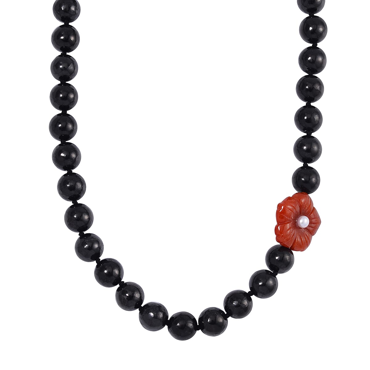 Red Jade Carved Flower (D), Freshwater Pearl, Shungite 461.00 ctw Necklace in Rhodium Over Sterling Silver 20 Inches