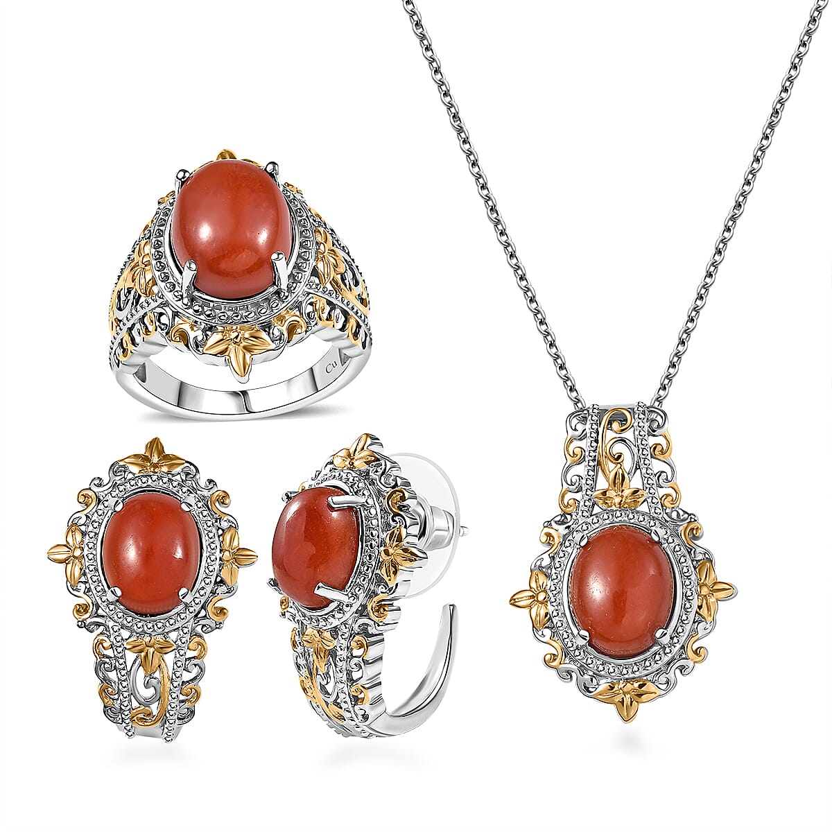 Red Jade (D) 17.40 ctw Earrings, Ring (Size 7.0) and Pendant in 14K YG and Platinum Over Copper with Magnet with Stainless Steel Necklace (20 Inches)