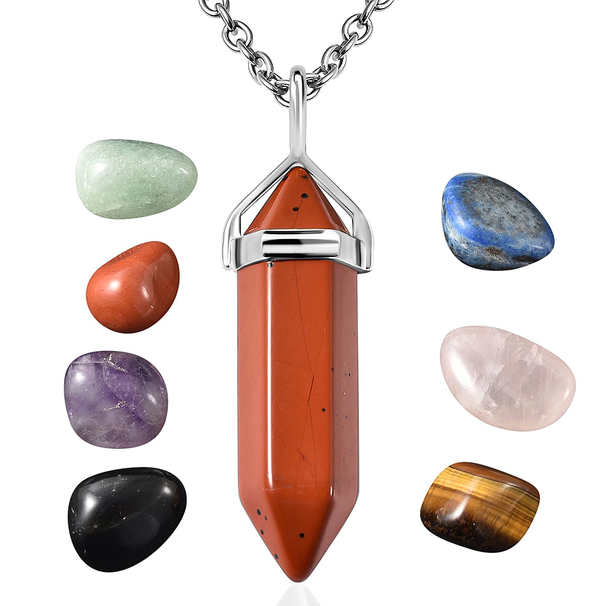 Red Jasper Pendant with 7 Chakra Tumbled Gemstones in Silvertone with Stainless Steel Necklace 20 Inches 307.50 ctw