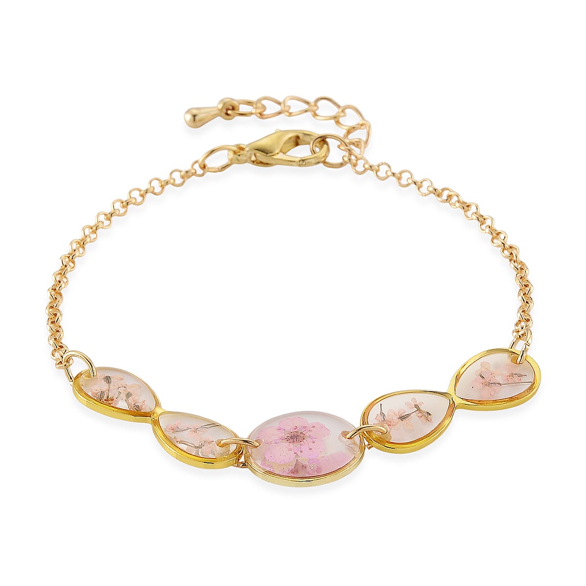 Resin Bracelet with Dry Flowers Filled Round Shaped Charms in Goldtone (7.5-8.5In)