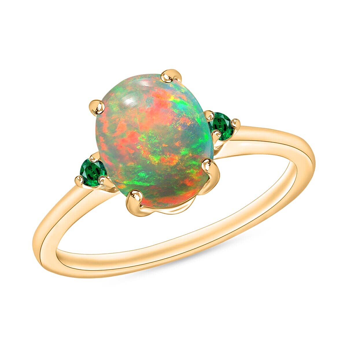 Rhapsody 18K Yellow Gold AAAA Ethiopian Welo Opal and Boyaca Colombian Emerald Ring (Size 4.5) 5.50 Grams 1.30 ctw (Del. in 10-12 Days)