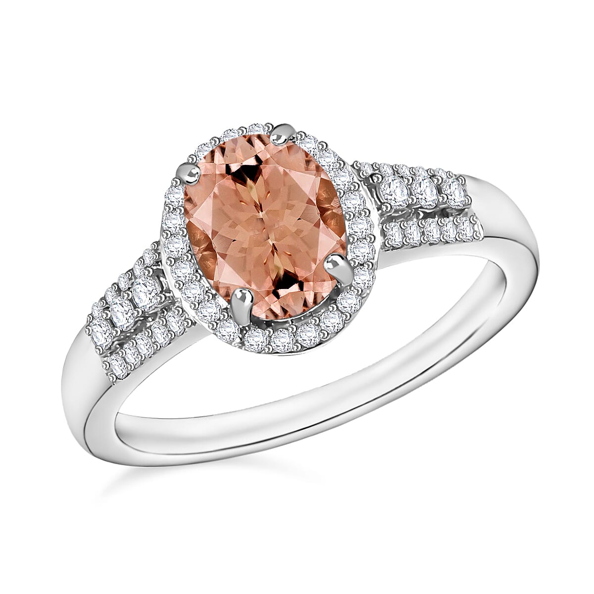 Shine brilliantly with this morganite ring in durable metal. The peach-colored oval stone creates an aura of sophistication instantly. Its dazzling diamond accents make this luxury custom ring perfect for special moments.