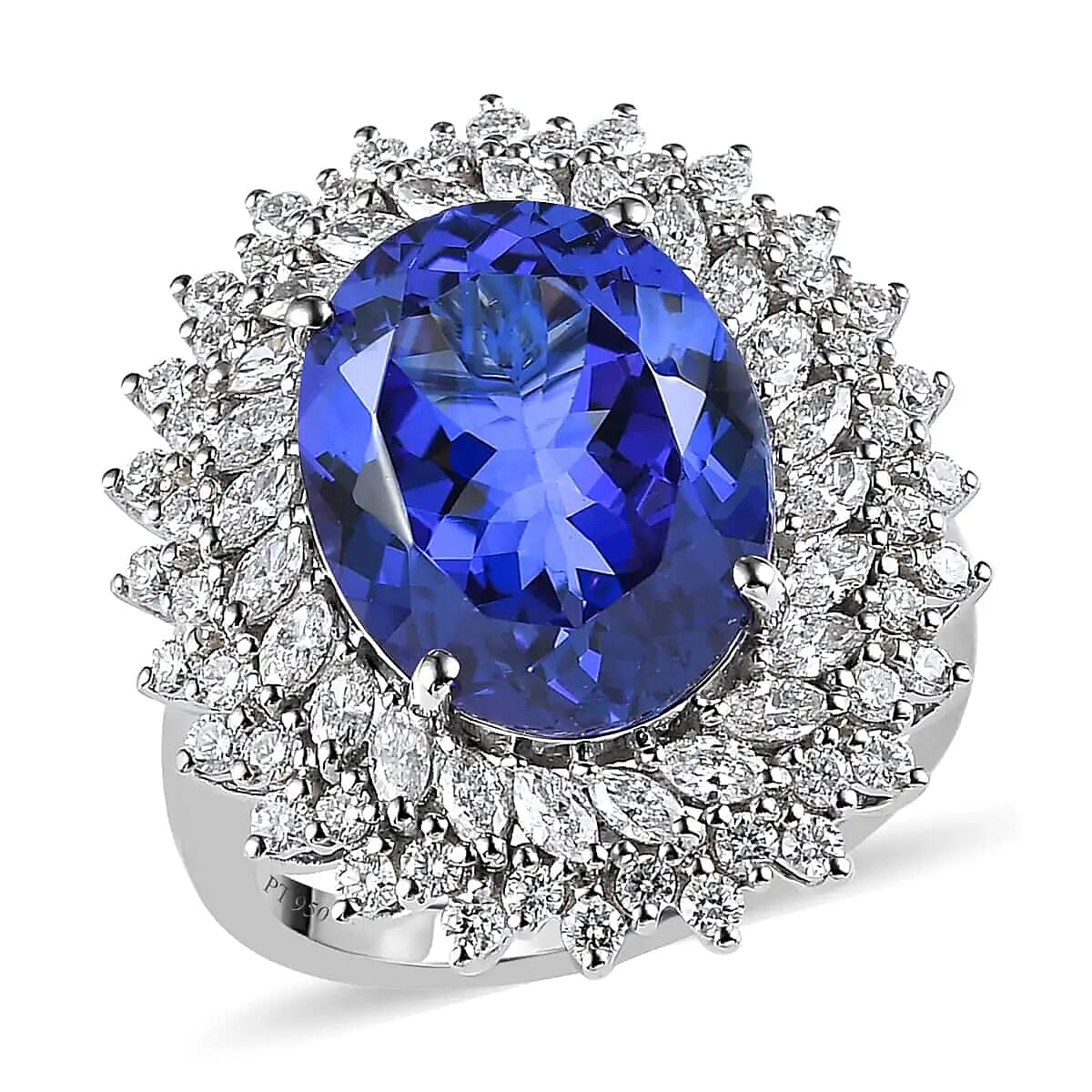 and luxury. This ring from the Rhapsody Collection features an oval-shaped rare gem in the center highlighted by an array of marquise-shaped diamonds. Each marquise shape gem is held in prongs avoiding the chipping of pointed ends and placed precisely. The arrangement of these gems is at a different angle, so with every move of yours, it resonates its brilliance. The array of round diamonds surrounds the center design reflecting a double halo appearance. Halo rings are popular throughout history for their uniqueness in illuminating the gemstone in the center. The double halo style adds an edgy look to traditional styles making the rings go well with contemporary fashion. Tanzanite is a rare gem and with the history of being formed 585 million years ago in the foothills of a mountain, the pleochroism phenomenon it exhibits makes this ring more adorable. The hardness of the tanzanite gem makes this 950 platinum-crafted ring suitable for everyday wear.