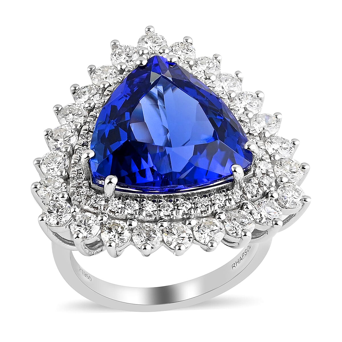 This stunning sunburst-halo-styled AAAA tanzanite ring is from the Rhapsody Collection, a luxurious brand that features premium quality gemstones finely crafted platinum designs that can be treasured forever. Featuring a perfectly cut trillion-shaped tanzanite, this sunburst halo ring is made from 950 platinum. The dual halo of diamonds makes this ring a captivating piece to own. Since it in mined only at one location, it is a gem rarer than diamonds. Cherished for its rich, vivid color and clarity, AAAA grade gemstone is widely classified for featuring intensely saturated color and tones.