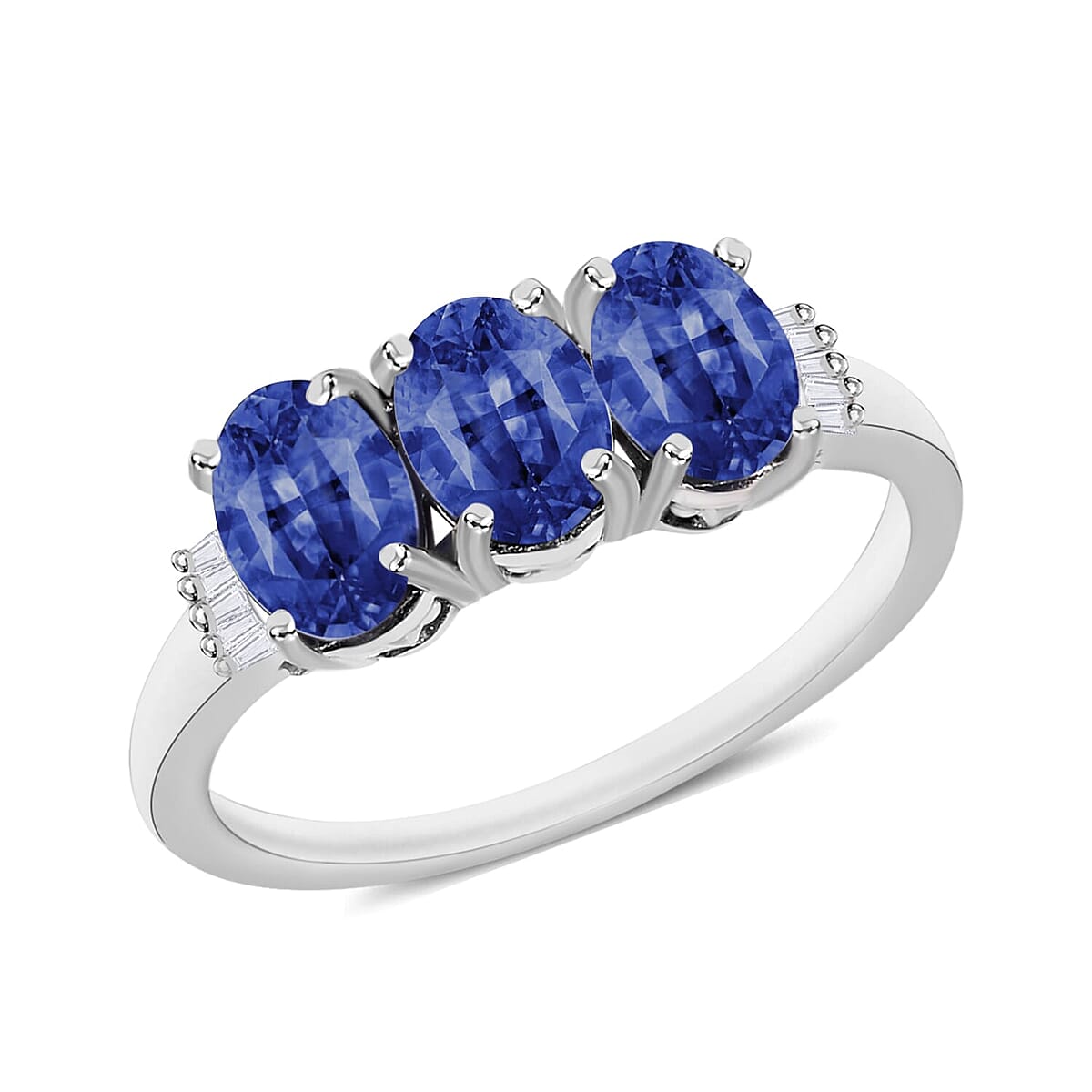 Refine your elegance with this stunning blue sapphire and diamond 3-stone ring in durable metal. This classic sapphire ring for women is paired with brilliant diamonds for a timeless, sophisticated look. Make this blue sapphire ring uniquely yours by customizing it to reflect your style.