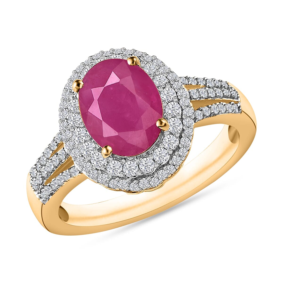Rhapsody AAAA Mozambique Ruby and E-F VS2 Diamond 2.66 ctw Double Halo Ring in 18K Yellow Gold (Size 5.5) 4.60 Grams