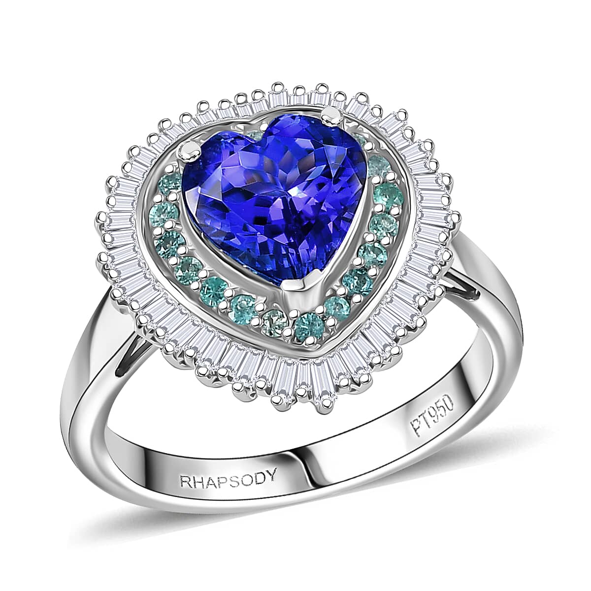 Upgrade your style with this Rhapsody tanzanite, tourmaline, and diamond ring in 950 platinum. This elegant halo ring showcases vivid color and exceptional sparkle in a heart design. This platinum ring brings radiant sophistication to every occasion.