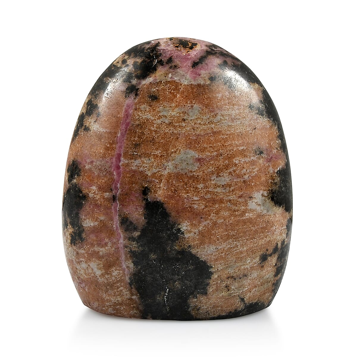 Soft pink hues and organic form define this rhodonite freeform, creating a warm and inviting decorative accent. Its smooth finish and natural character bring balance and gentle color to your space. Designed to enhance interiors with refined softness.
