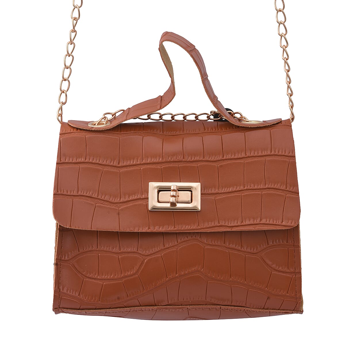 Royal Siamese Brown Croc Embossed Faux Leather Mini Handbag with Detachable Chain Shoulder Strap
