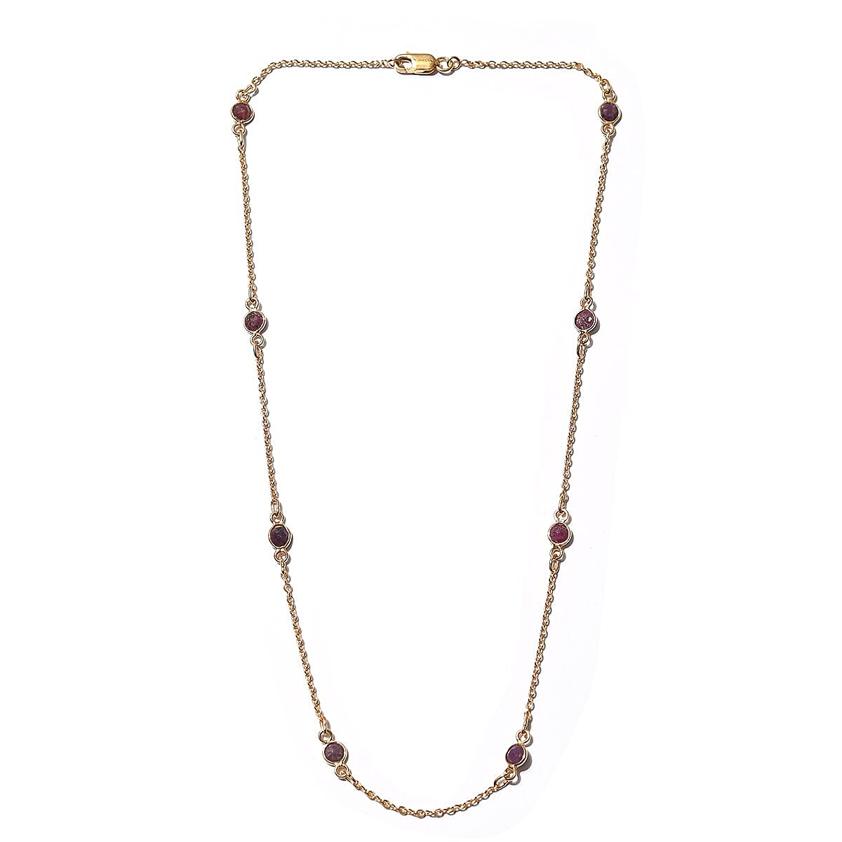 Inspired by station-themed jewelry this Royal Thai ruby necklace beautifies your look with a unique touch of elegance. This modern yet versatile station necklace accents are lovely as it sways with ruby roundels that flicker with a glow, giving you that show stop appeal as it suspends in polished 14K yellow gold-plated sterling silver. A station necklace is exactly how it sounds; adornments sit along a chain in stations, be they gemstones (often bezel set), beads or even an assortment of shapes. Symbolic of everlasting love, ruby sparkle is an indistinguishable flame of passion; hence they are the most popular gemstone for jewelry.
