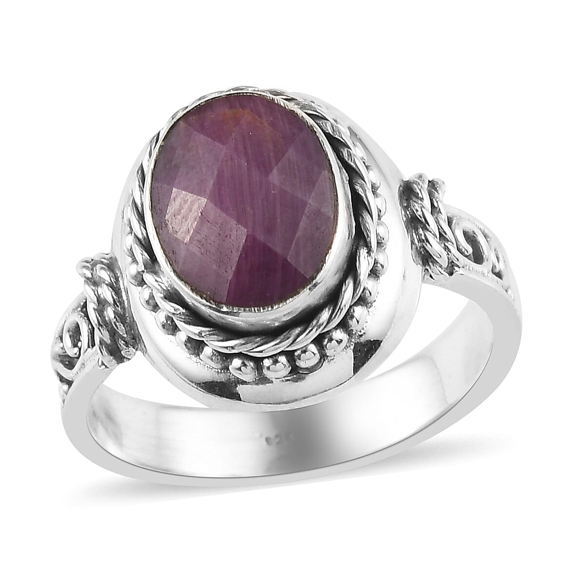 Inspired by the theme of togetherness and strong bond, this Royal Thai ruby ring has a subtle appearance. The oval-shaped faceted gem in the center is encircled by a metal rope-like pattern and beads. The detailed look of the ring is displayed more by the presence of a rope pattern on the shoulder and swirls o the shank of the ring. Crafted in sterling silver, this ring displays the captivating look of the birthstone of July and owing to its hardness; this adornment is excellent for daily wear. The intensified red hue of the gem is due to the presence of chromium, thus making this ring look brighter.
