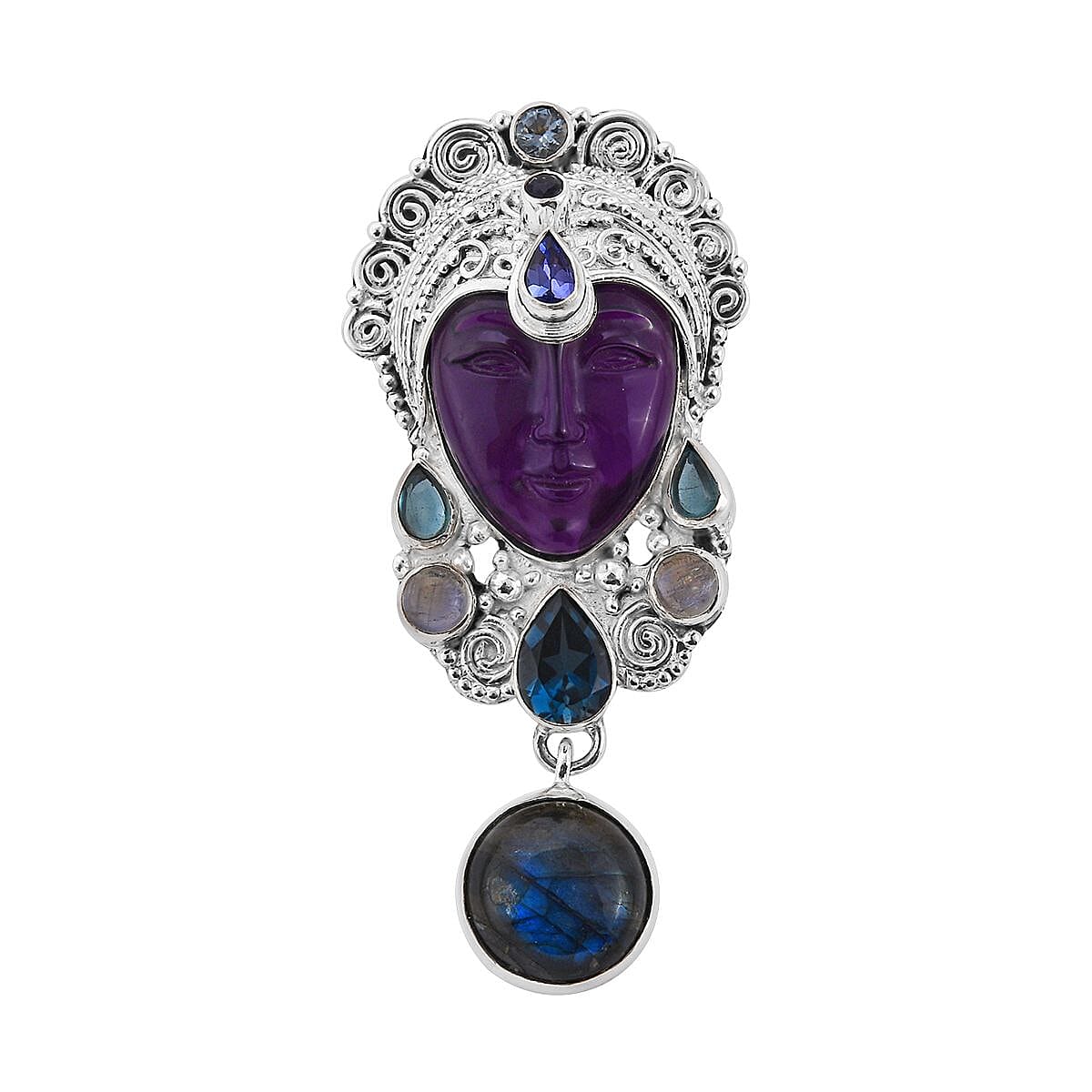Add a majestic amethyst carved multi-gemstone pendant/brooch to your ornamental collection for a more glamourous look while you go out wearing it. This pendant/brooch features exquisite metal crafting with multi-gemstone embellishments. Additionally, this pendant/brooch is drenched in sterling silver.