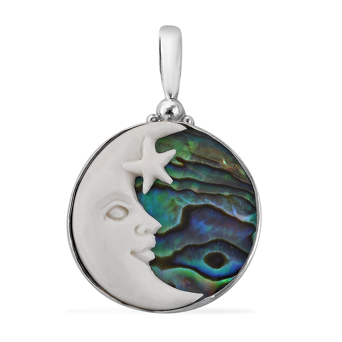 Flaunt stunning jewelry on the neckline with this beautiful carved bone and abalone shell crescent moon pendant. The pendant features an abalone shell solitaire base with a carved bone crescent moon with a star on the shell base. The pendant has sterling silver crafting that has entrusted with a style for contemporary and traditional attires. In addition, its exotic moon motif makes this jewelry an ideal accessory to fully show your taste and personality.